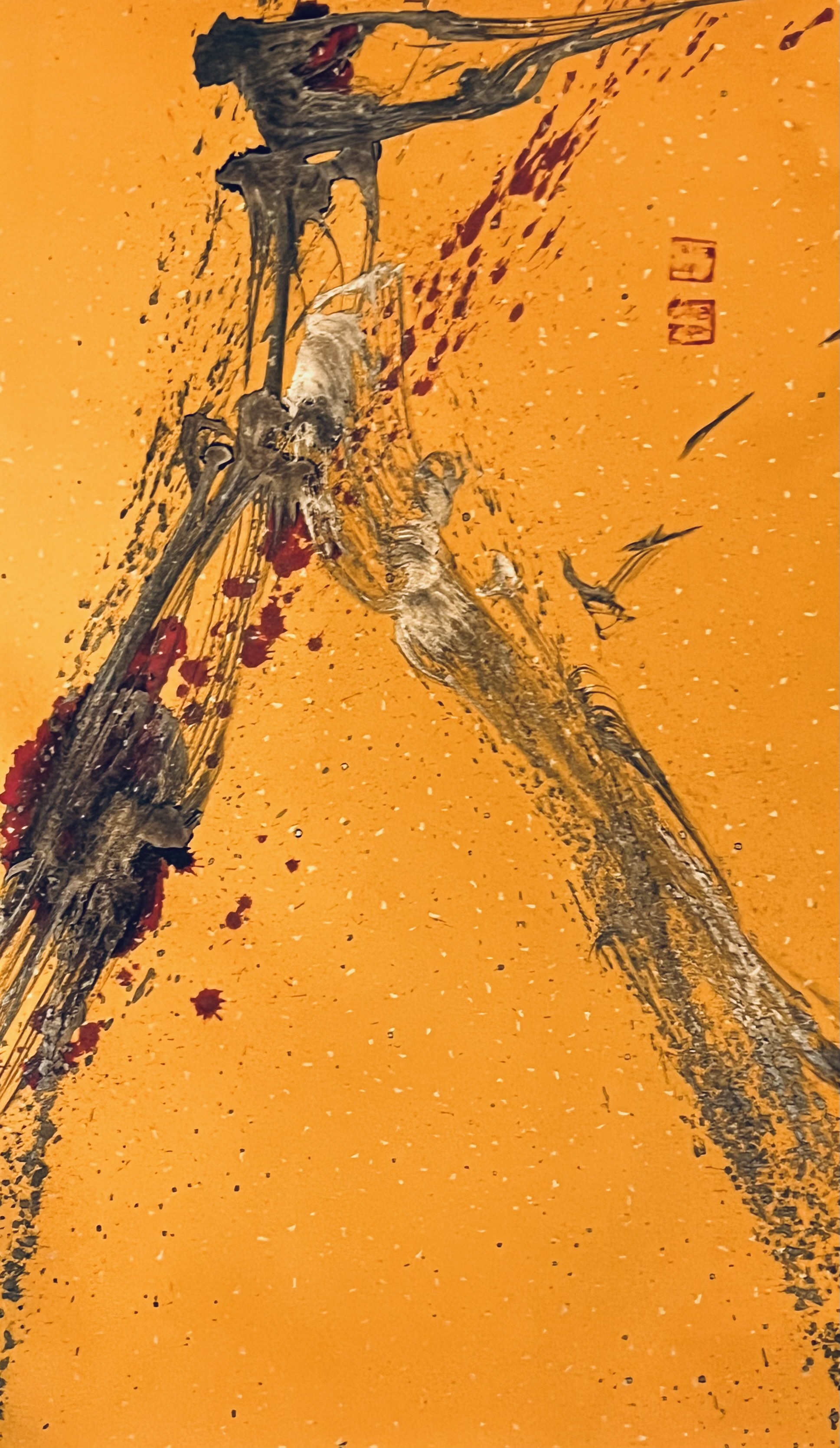 shodó kaligrafie na žlutém papíře s prvkami zlata, čínská tuš, adjustována v brokátu